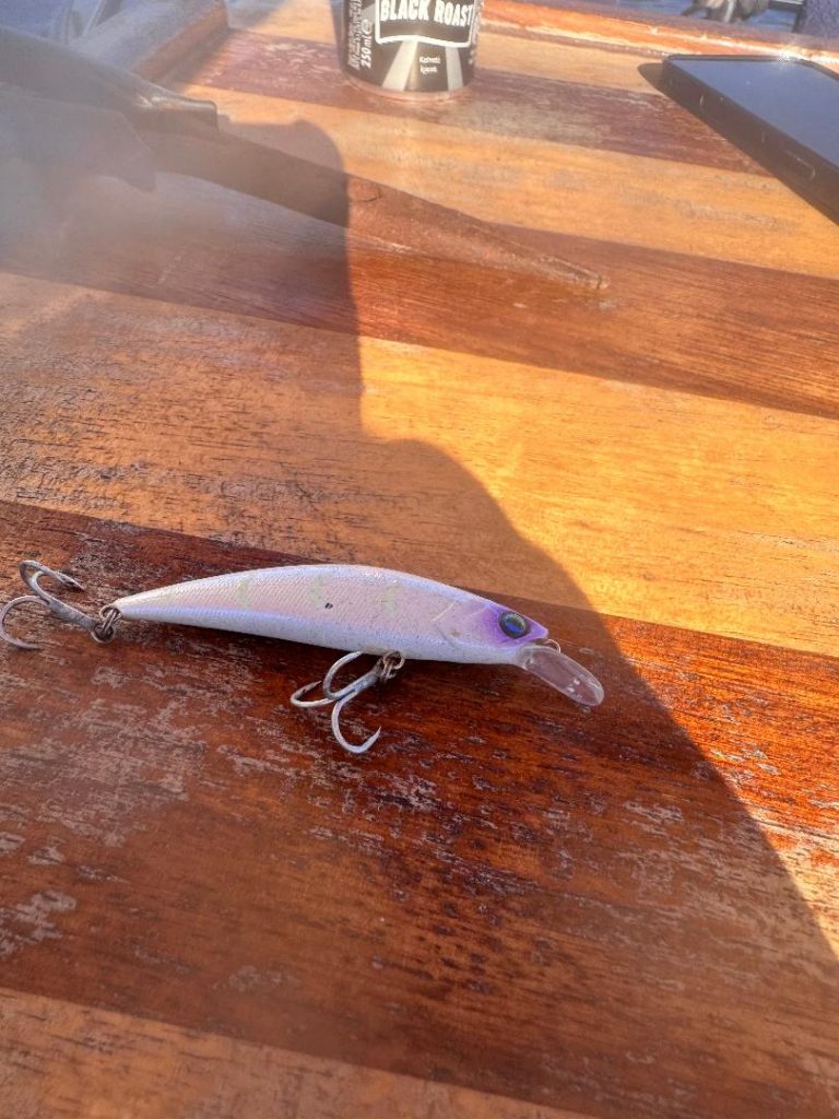 We worked hard, tracing 100 metres of line behind the boat, the lure dancing about a metre deep in our wake. Levant, a true professional, put us over every promising patch he knew, switching between trolling routes and even stopping to try some vertical jigging with 60g metals when we marked potential structure.